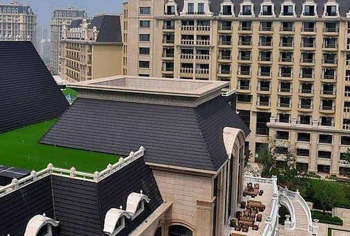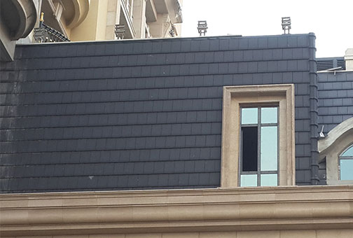 希尔顿酒店的屋顶也是德式城堡式的设计,双坡屋顶很陡,内有阁楼,屋面开窗。 屋面坡度达到70°,已经类似于幕墙,大大增加了安装难度。同时伴有海边特有的暴雨、台风、曝晒的极端气候环境,大大增加安装难度。