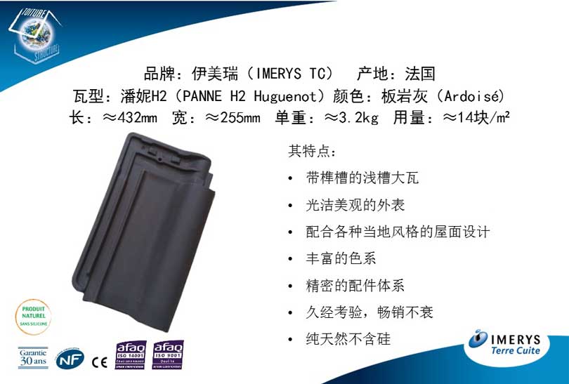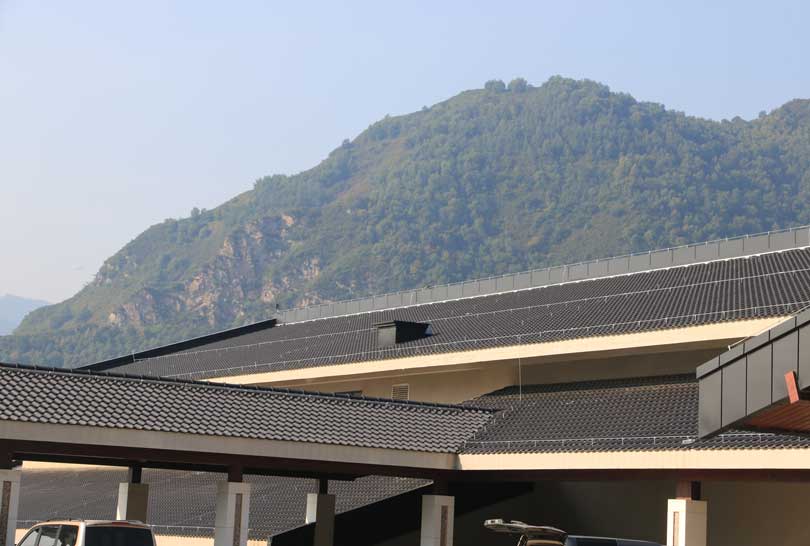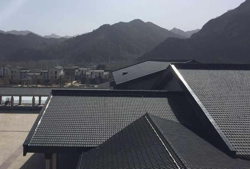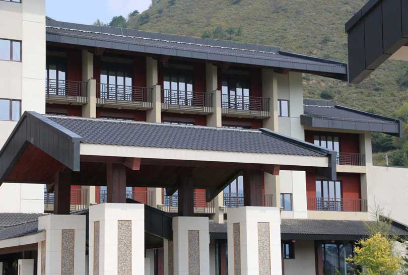 屋顶选用法国伊美瑞的 潘妮 H2黑色瓦,缘于建筑风格和色调统一,另外也考虑到五台山气候寒冷,夏季雨水多的环境因素,需要屋面瓦具有防水抗风以及防冻融等特性,潘妮 H2黑色瓦以优异的性能、和谐的色彩完美地将法国陶土瓦铺在中式建筑的屋顶上。